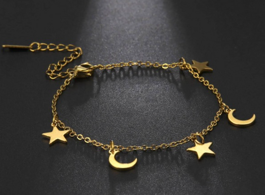TOBILLERA EN STAINLESS STEEL DORADO CON LUNAS Y ESTRELLAS