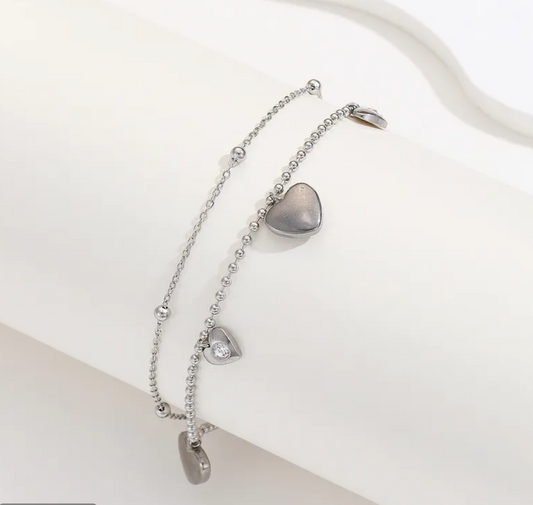 TOBILLERA DOBLE EN STAINLESS STEEL PLATEADO CON COLGANTES DE CORAZONES