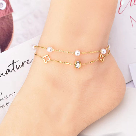 TOBILLERA DOBLE EN STAINLESS STEEL CON PERLAS Y ZIRCONIAS